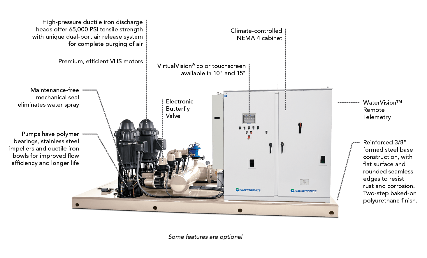 Ideal for pumping from reservoirs, rivers and wells, the vertical turbine (VT) system from Watertronics is a single-source solution that can meet virtually any pressure and flow requirement regardless of water lift or depth. Our advanced pump logic uses actual pump curve data to provide intelligent sequencing for optimal wire-to-water efficiency. Engineered for continuous operation in challenging environments, the VT is reliable, rugged, and long-lasting. Your pump station arrives pre-packaged and factory tested, ready for quick installation and start-up. With proven reliability and pumping efficiency, the VT offers a cost-effective solution and can be fully customized to meet your needs.